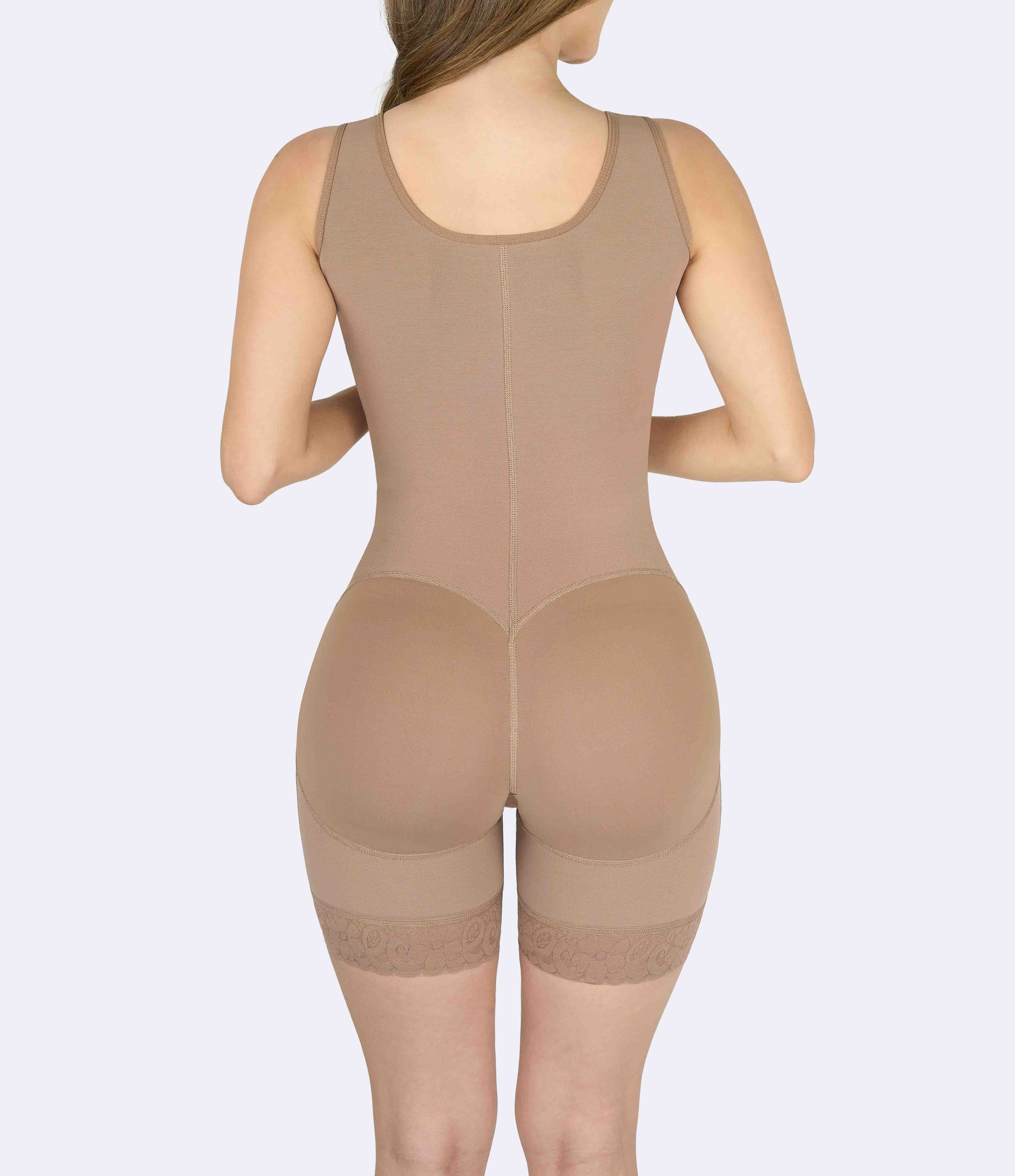 Shapewear with an integrated bust and three levels of adjustable support for a defined and comfortable silhouette. Designed with high compression to sculpt and contour your figure, featuring non-slip lace on the thighs and a discreet finish perfect for everyday wear.